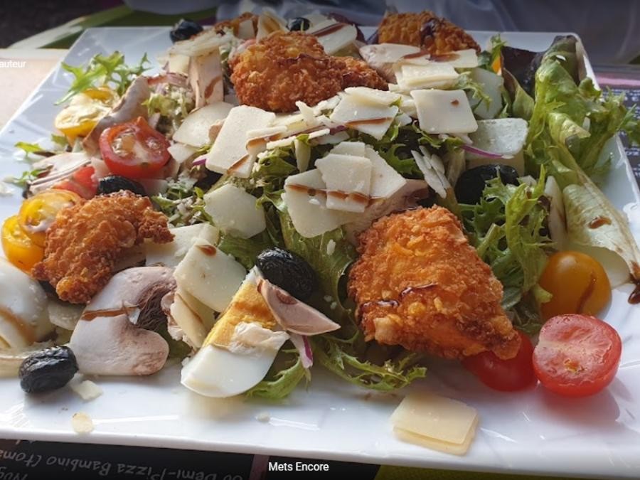 Salade, Tomates, Beignetsd de Poulet, Oignons, Champignons, Oeufs, Copeaux de Parmesan